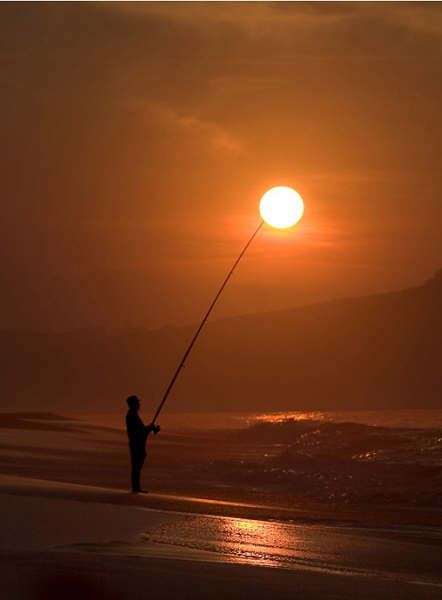 A horgászbottal elkapja a napkorongot és megpróbálja lehozni az égről. Hmmm... Értem, de ez szerintem inkább művészi fotó, mint nevetséges. Én azt a címet adtam volna neki az Omega után, hogy Napot hoztam, csillagot...