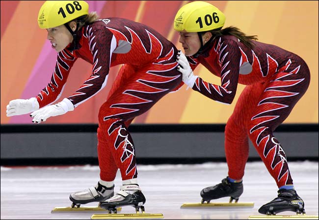 Így elsőre tényleg poénos,de ez a gyorskorcsolyában teljesen szokványos jelenet.A váltóversenyben éppen váltanak.