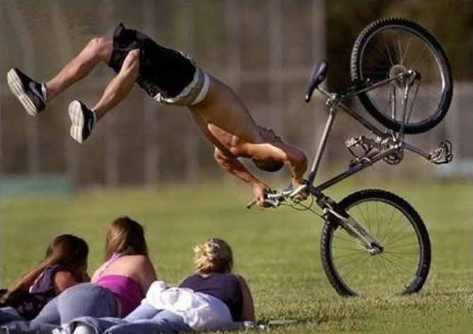 Szerintem a mutatvány része. Elbaxott elsőkeréken megálláskor nem így esik az ember.